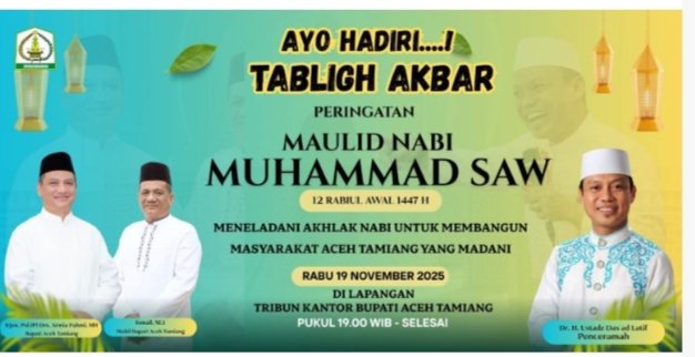 Tabligh Akbar dijadwalkan berlangsung pada Rabu, 19 November 2025, pukul 19.00 WIB di Lapangan Tribun Kantor Bupati. Ini merupakan tabligh akbar perdana di bawah kepemimpinan Bupati Armia Pahmi dan Wabup Ismail.