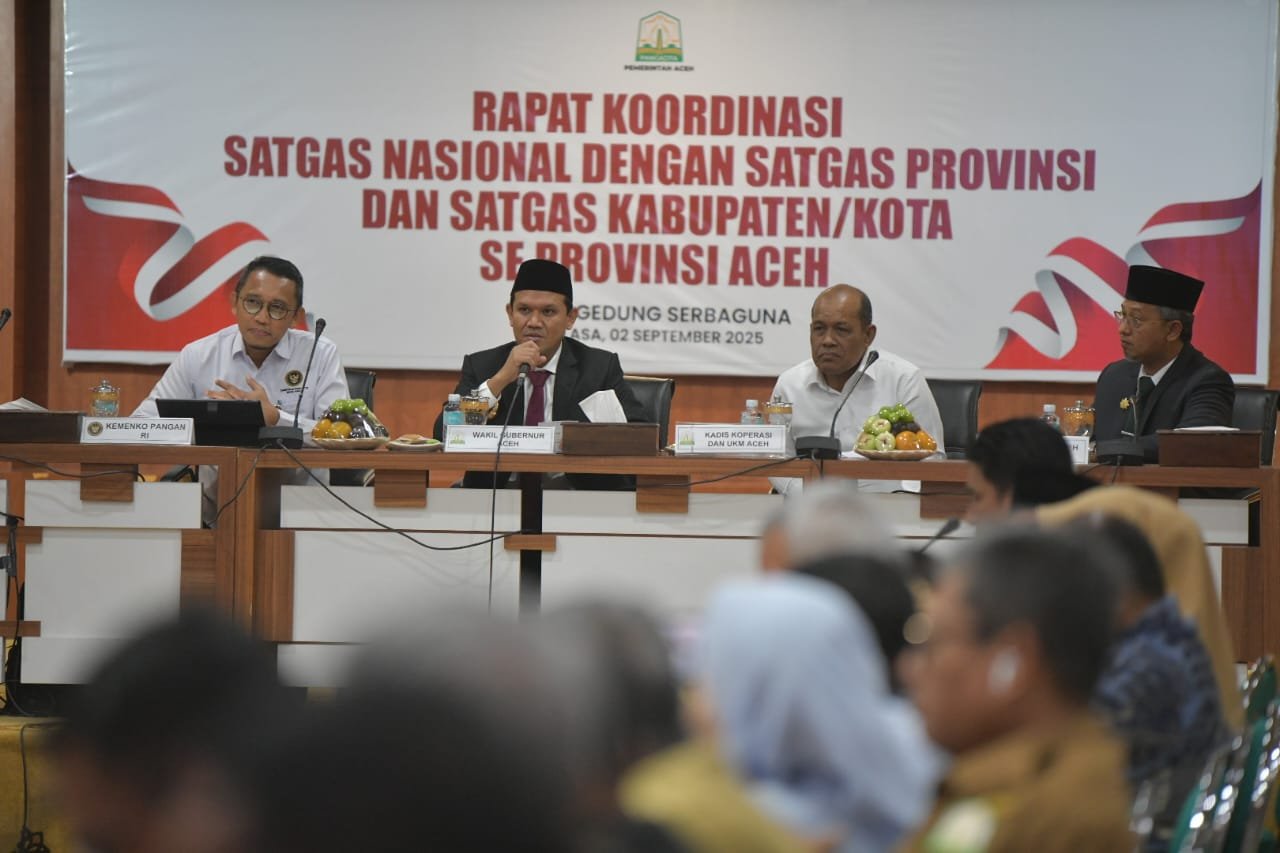 Banda Aceh – Wakil Gubernur Aceh, H. Fadhlullah, SE., membuka secara resmi Rapat Konsolidasi Satuan Tugas (Satgas) Nasional dengan Satgas Provinsi serta Satgas Kabupaten/Kota se-Aceh dalam rangka percepatan pelaksanaan Koperasi Desa (Kopdes) Merah Putih. Pertemuan tersebut digelar di Gedung Serbaguna Setda Aceh, Selasa (2/9/2025).