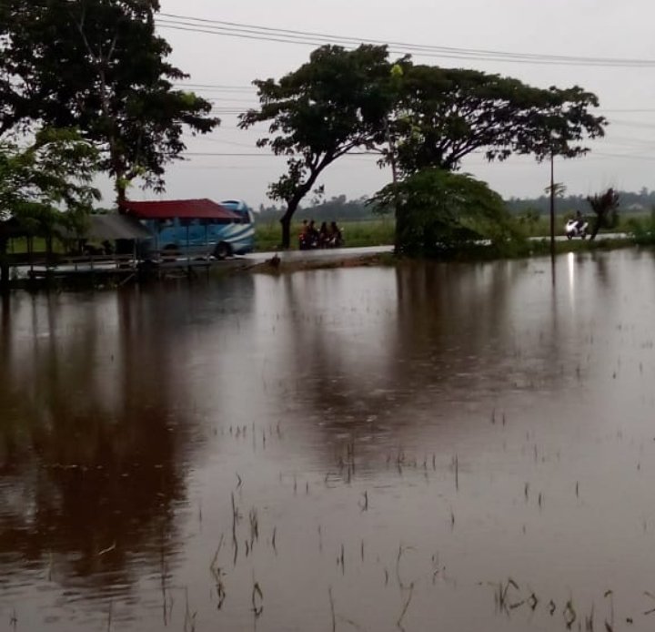 Banjir telah meluap dan merendam dataran badan jalan serta area perumahan warga di sekitar desa tersebut.