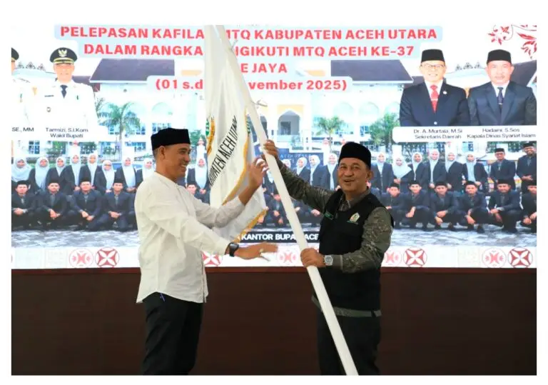 Bupati Aceh Utara H. Ismail A. Jalil, SE., MM (Ayah Wa) melalui Wakil Bupati Tarmizi Panyang, S.I.Kom secara resmi melepas keberangkatan para duta Qur’ani itu di Aula Kantor Bupati Aceh Utara, Landing, Lhoksukon, Jumat (31/10/2025).