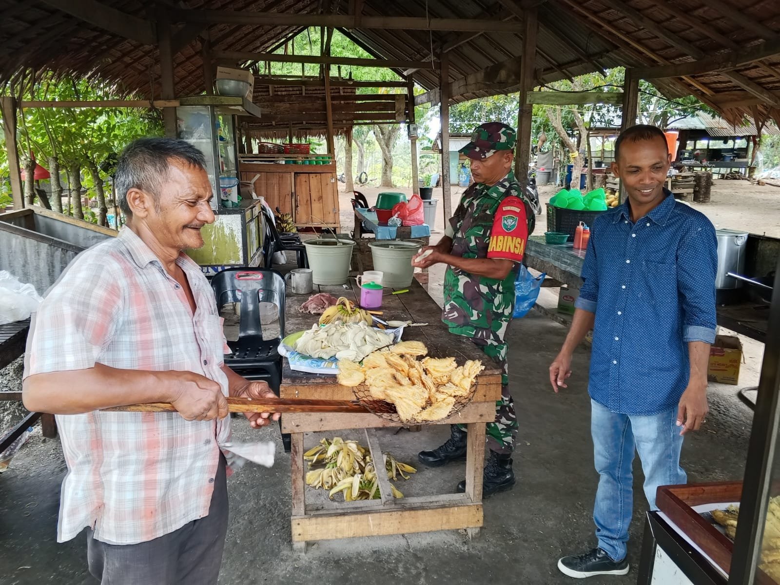 Kegiatan tersebut dilakukan dengan menyambangi salah satu pelaku UMKM yang cukup dikenal warga setempat, yakni penjual gorengan yang akrab disapa “Lem Budi”. Dalam suasana santai dan penuh keakraban, Sertu Junaidi berdialog langsung guna mengetahui kondisi usaha sekaligus mendengarkan berbagai kendala yang dihadapi.