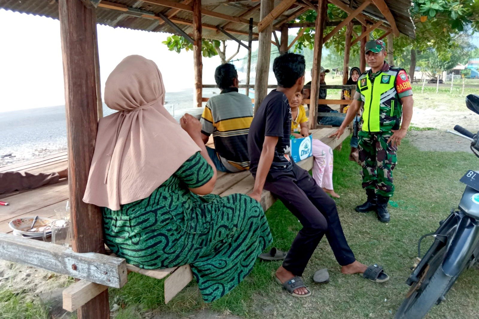 Aceh Besar – Keindahan Pantai Gampong Layeun, Kecamatan Leupung, selalu menjadi daya tarik utama bagi wisatawan lokal. Guna memastikan kenyamanan para pengunjung, Babinsa Koramil 19/Leupung, Kodim 0101/Kota Banda Aceh, Sertu Nuril Wathon, melaksanakan pemantauan wilayah sekaligus menjalin komunikasi sosial dengan para pelancong di bibir pantai, Minggu (19/4/2026).
