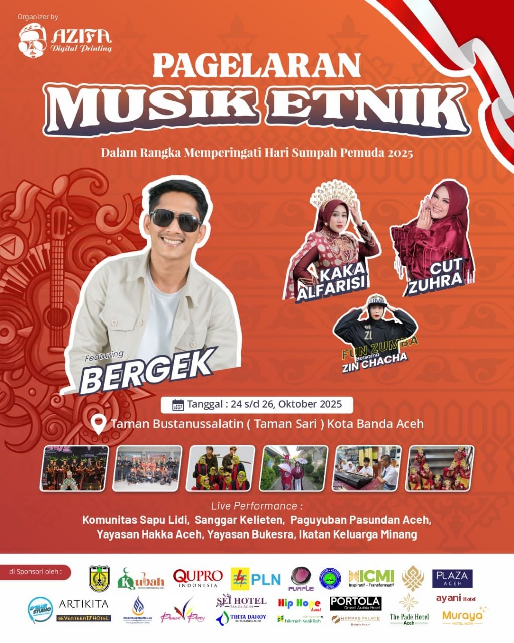Banda Aceh. Pagelaran Musik Etnik akan digelar di Taman Bustanulssalatin ( Taman Sari) Banda Aceh selama tiga hari pada tanggal 24 sd 26 Oktober 2025.