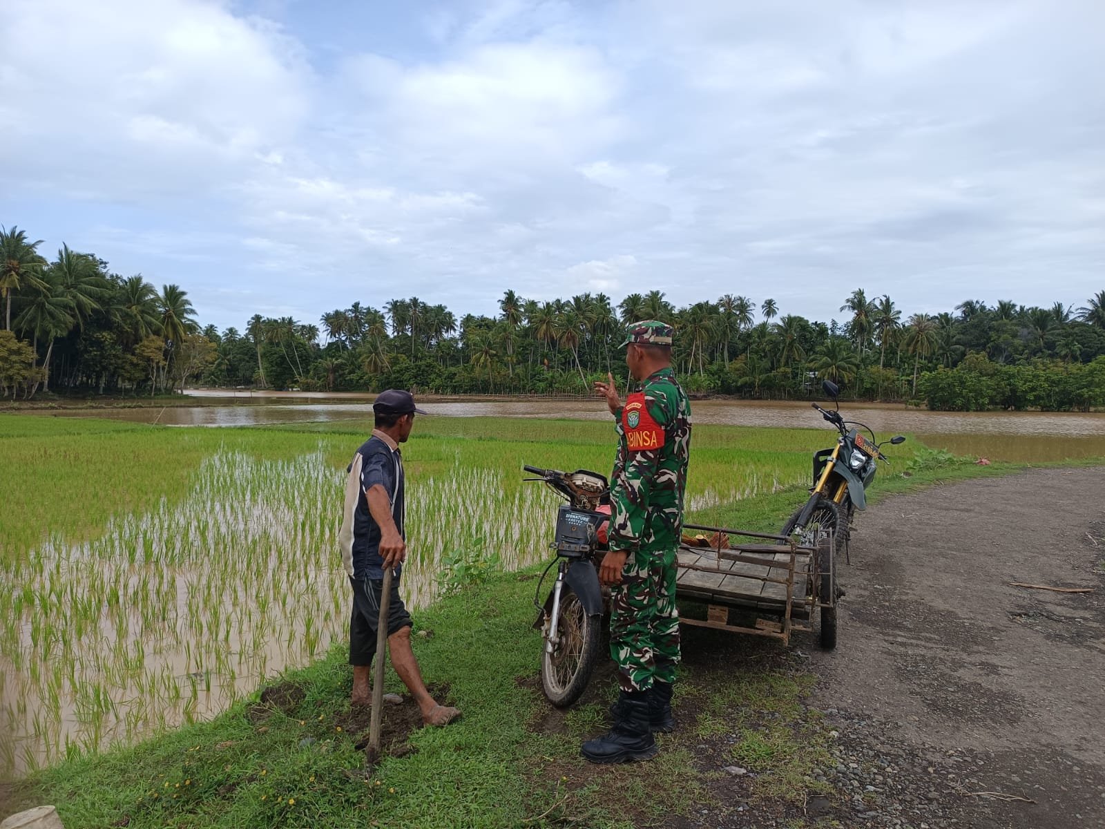 Sertu Sufriadi menyampaikan bahwa kehadiran Babinsa di tengah masyarakat bertujuan untuk memantau situasi sekaligus memberikan pendampingan kepada petani yang terdampak. Selain itu, Babinsa juga menyerap aspirasi warga terkait kendala yang dihadapi akibat genangan air di area persawahan.