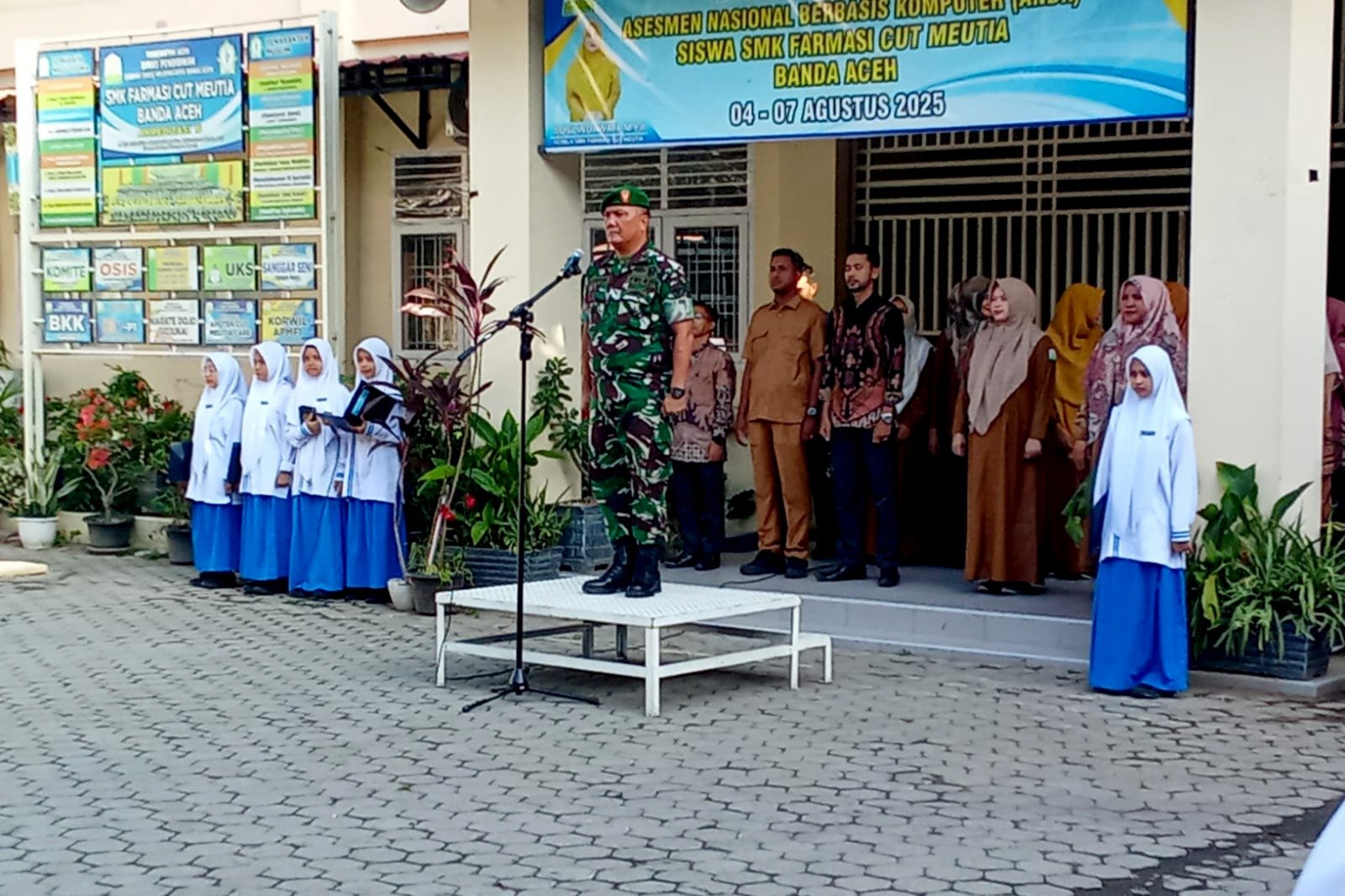 Banda Aceh – Danramil 14/Baiturrahman Kodim 0101/Kota Banda Aceh, Kapten Cke Ratno Timur Siregar, menjadi pembina upacara bendera di Sekolah Menengah Kejuruan (SMK) Farmasi Cut Mutia, Kota Banda Aceh, Senin (6/10/2025).