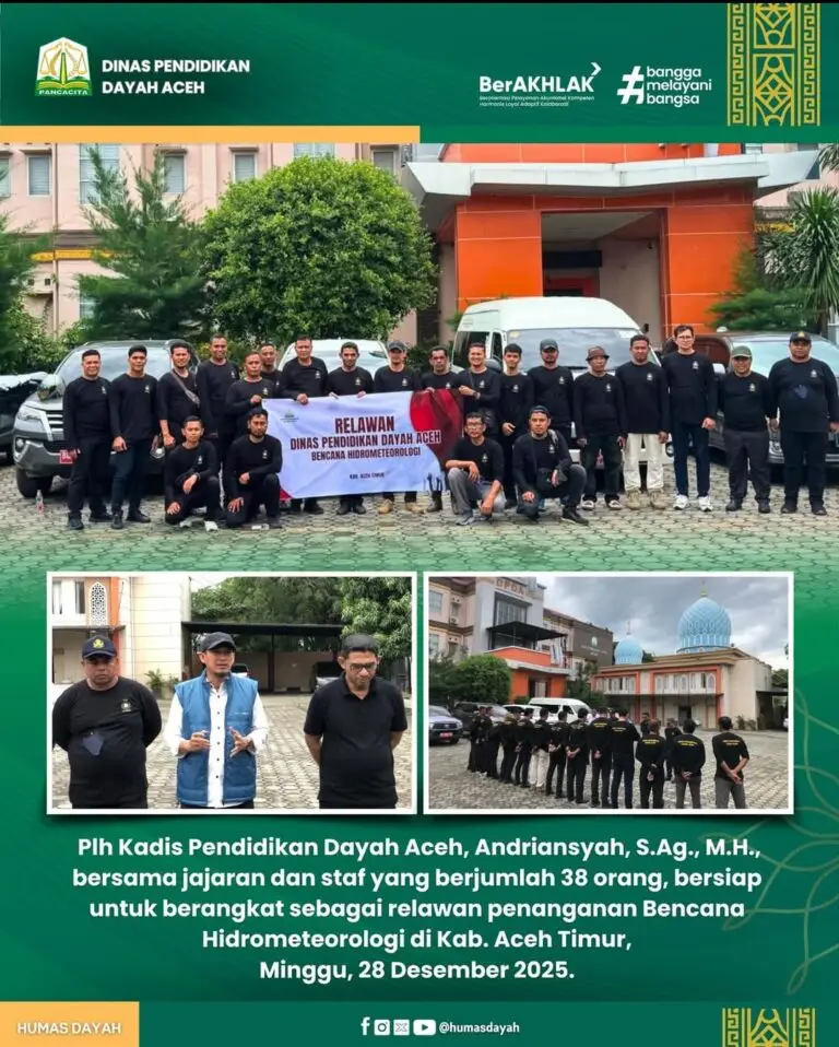 Banda Aceh – Plh Kepala Dinas Pendidikan Dayah Aceh, Andriansyah, S.Ag., M.H., bersama jajaran pejabat dan staf, menyatakan kesiapan penuh untuk terjun langsung sebagai relawan dalam penanganan bencana hidrometeorologi di Kabupaten Aceh Timur. Sebanyak 38 orang dari lingkungan Dinas Pendidikan Dayah Aceh diberangkatkan pada Minggu, 28 Desember 2025, sebagai bagian dari upaya kemanusiaan Pemerintah Aceh dalam membantu masyarakat terdampak bencana.