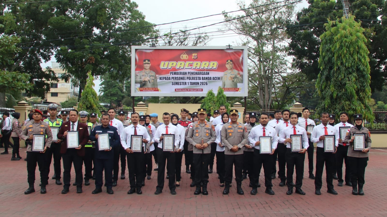 Banda Aceh.Polresta Banda Aceh kembali menggelar upacara pemberian penghargaan bagi personel berprestasi. Kali ini 50 personel menerima penghargaan yang diserahkan langsung oleh Kapolresta Banda Aceh Kombes Pol Andi Kirana dihalaman Mapolresta, Senin (16/2/2026).