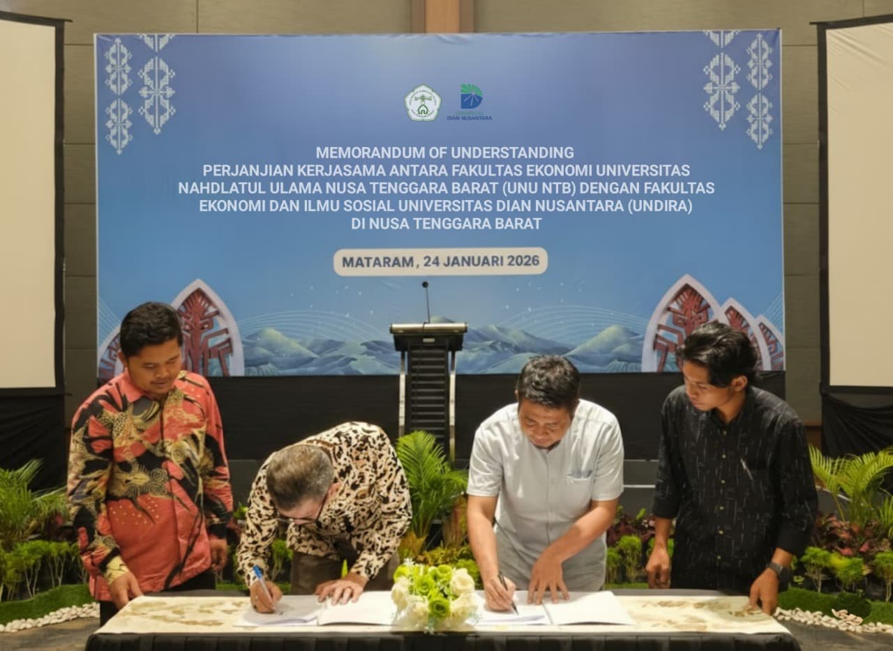 Mataram, 24 Januari 2026 – Fakultas Ekonomi Universitas Nahdlatul Ulama Nusa Tenggara Barat (FE UNU NTB) secara resmi menjalin kerja sama kelembagaan dengan Fakultas Bisnis dan Ilmu Sosial Universitas Dian Nusantara (FBIS UNDIRA) melalui penandatanganan Memorandum of Understanding (MoU). Penandatanganan yang berlangsung di PRIME PARK Hotel & Convention Lombok, Kota Mataram pada Sabtu (24/1/2026) sebagai bagian dari upaya memperkuat pelaksanaan Tri Dharma Perguruan Tinggi serta meningkatkan kualitas sumber daya manusia di bidang ekonomi dan ilmu sosial.