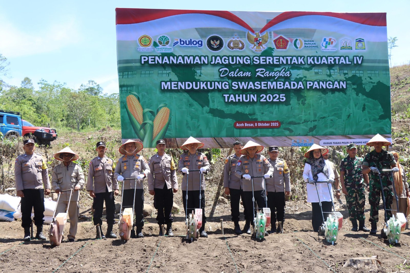 Aceh Besar,- Polres Aceh Besar kembali menunjukkan komitmennya dalam mendukung program ketahanan pangan nasional dengan melaksanakan penanaman jagung serentak kuartal lV bertempat di Desa Suka Damai Kecamatan Lembah Seulawah Kabupaten Aceh Besar, Rabu (08/10/2025)