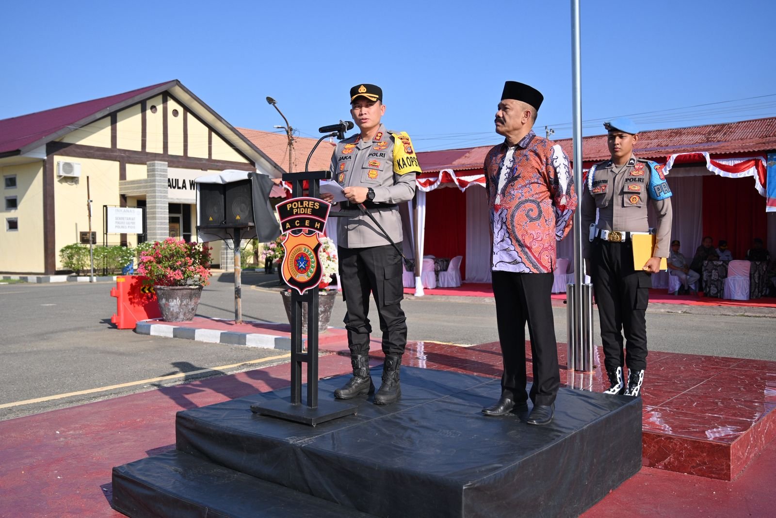 Turut hadir dalam kegiatan tersebut Bupati Pidie H. Sarjani Abdullah, SH bersama unsur Forkopimda Kabupaten Pidie, Wakapolres Pidie, para pejabat utama Polres Pidie serta para Kapolsek jajaran.