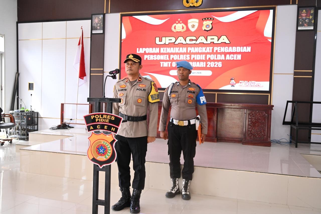 Sigli – Polres Pidie melaksanakan Upacara Laporan Kenaikan Pangkat Pengabdian Personel Polri Terhitung Mulai Tanggal (TMT) 1 Februari 2026, yang berlangsung di Aula Wira Satya Polres Pidie, Senin (2/2/2026)