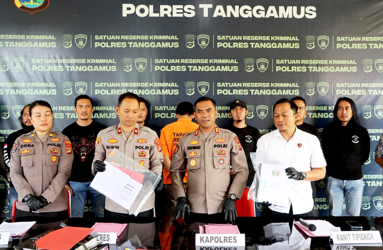Penetapan tersangka disampaikan Kapolres Tanggamus AKBP Rahmad Sujatmiko, S.I.K., M.H., dalam konferensi pengungkapan kasus di basemant Sat Reskrim Polres Tanggamus.