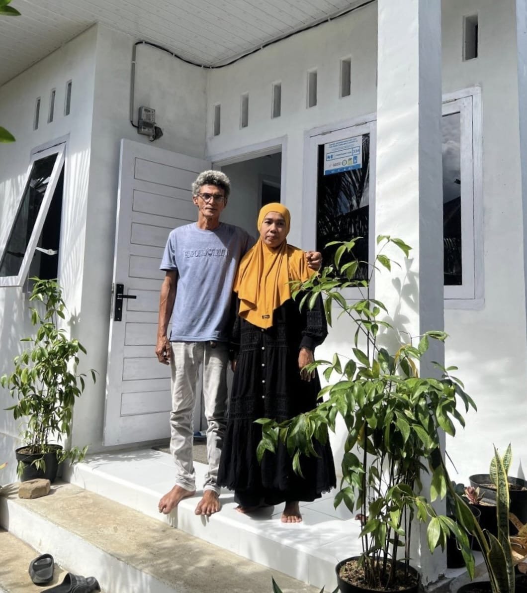 Ridwan dan istri penerima rumah layak huni di Desa Aneuk Paya, Kecamatan Lhoknga berfoto di depan rumah barunya.