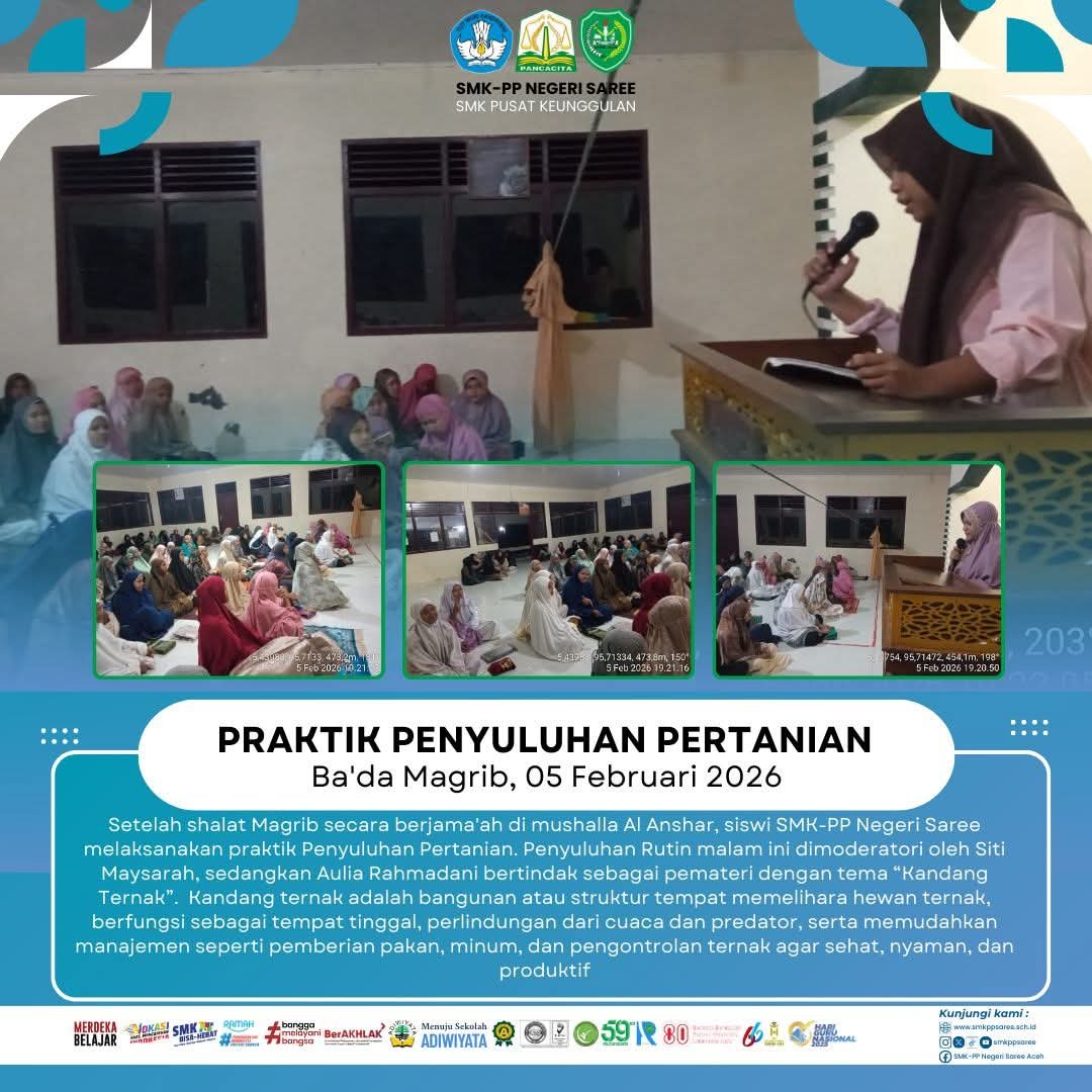 SAREE – Mengawali tahun 2026, SMK-PP Negeri Saree memperkuat komitmennya sebagai sekolah pusat keunggulan dengan menggelar Praktik Penyuluhan Pertanian intensif bagi para siswanya. Kegiatan yang berlangsung sepanjang Januari hingga Februari 2026 ini dirancang khusus untuk mengasah keterampilan teknis dan komunikasi calon penyuluh masa depan di bidang agribisnis.
