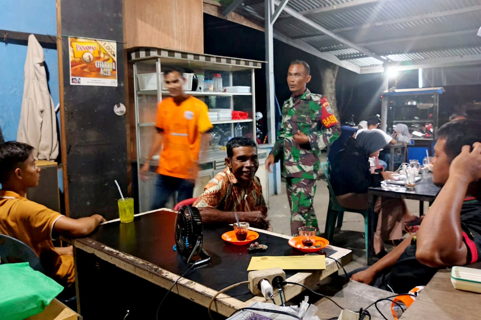 Tampak terlihat Serda Fajri, salah satu Bintara Pembina Desa (Babinsa) Koramil 19/Leupung, yang sedang melaksanakan patroli keamanan lingkungan pada malam hari ini difokuskan di wilayah Kecamatan Leupung, Kabupaten Aceh Besar. Berbeda dengan patroli konvensional, Serda Fajri melaksanakan pendekatan humanis dengan secara langsung menyambangi pusat-pusat keramaian dan tempat berkumpulnya warga.